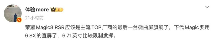 另外,博主@体验more 近日的一份爆料中显示,“荣耀Magic8 RSR应该是主流TOP厂商的最后一台微曲屏旗舰了,下代Magic要用6.8X的直屏了,6.71英寸比较限制发挥。”