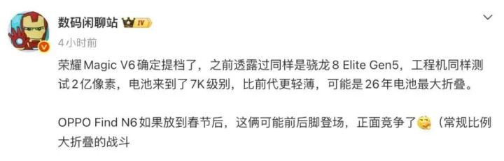 据悉,博主@数码闲聊站 最近的一份爆料中提到,荣耀Magic V6确定提档了,之前透露过同样是骁龙8 Elite Gen5,工程机同样测试2亿像素,电池来到了7000mAh级别,比前代更轻薄,可能是26年电池最大折叠。